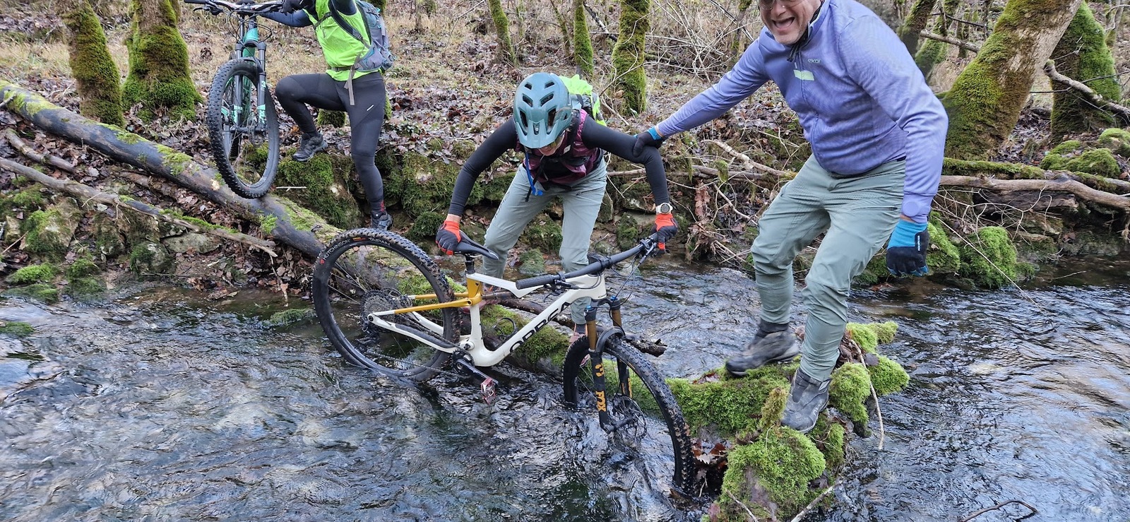 Plus loin, encore un ruisseau à franchir : Ce sera en équilibre sur un tronc d’arbre, pas si stable que ça ! Après les cris de Severine, on entend un plouf. Mince, on a perdu Moni…… (oups, on avait promis qu'on ne dirait rien). Que de surprises ! Pourtant notre guide avait bel et bien reconnu cette rando de jour. Peut-être en été ?
