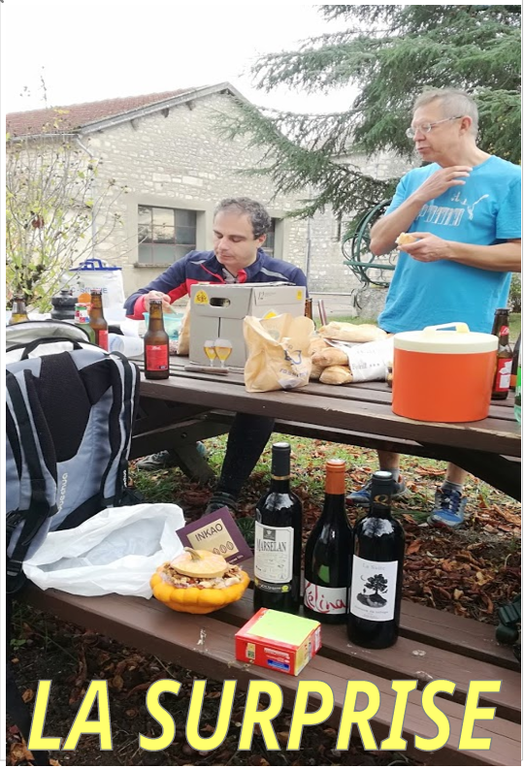 Rando bleue achevée on passe à table , chacun sortira sa gamelle et brusquement Raphaël changera de protocole . Il a quelque chose à nous annoncer en faisant dans la « sériosité » : Anniversaire pépé Alain . Pourvu que le clocher ne se casse pas la gueule ! L’an dernier nous étions à Mirepoix 31 et vous savez tous que le pont est tombé dans le Tarn avec des conséquences dramatiques . C’est juste un petit rappel d’Ugo par sms et absent de ce rdv : Dommage tu ne te rinceras pas le gosier mon vieux ! Et oui Serge dégaine les bouteilles , pour Michèle ce sera la citrouille pleine de graines chères à Alain , Moustic qui malgré son absence pensera aux chaufferettes grâce à Mimi , +++ fallait être là !