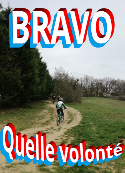 Oui car toi l’ornière ou es-tu désormais ? , tu n’es que désillusion , mais tu as laissé un profond sillon dans le cerveau de celle qui ose revenir te revoir . Honte à toi , car tu étais devenue une routine sans âme , sans cœur d’ailleurs tu as disparu , tu as trouvé plus fort sous les butoirs des engins agricoles ! . Toi le rail de terre sais-tu combien tu as été une ornière mentale durant tout ce temps . Aujourd’hui Moustic écrasera de ses roues rageuses l’endroit ou tu étais . Les images sont là , les émotions sont durant tout ce temps retenues , le besoin de poursuivre , la passion prédomine donc nous éprouvons une certaine fierté à redonner l’espoir du lendemain bonheur . Raphaël et moi lui demandons de remonter légèrement plus haut pour retraverser et cette fois sur le VTT . FAIRE FACE = OBJECTIF OBTENU et sans implorer St Benoît ! Une énorme satisfaction est dorénavant bien visible dans ses yeux .
