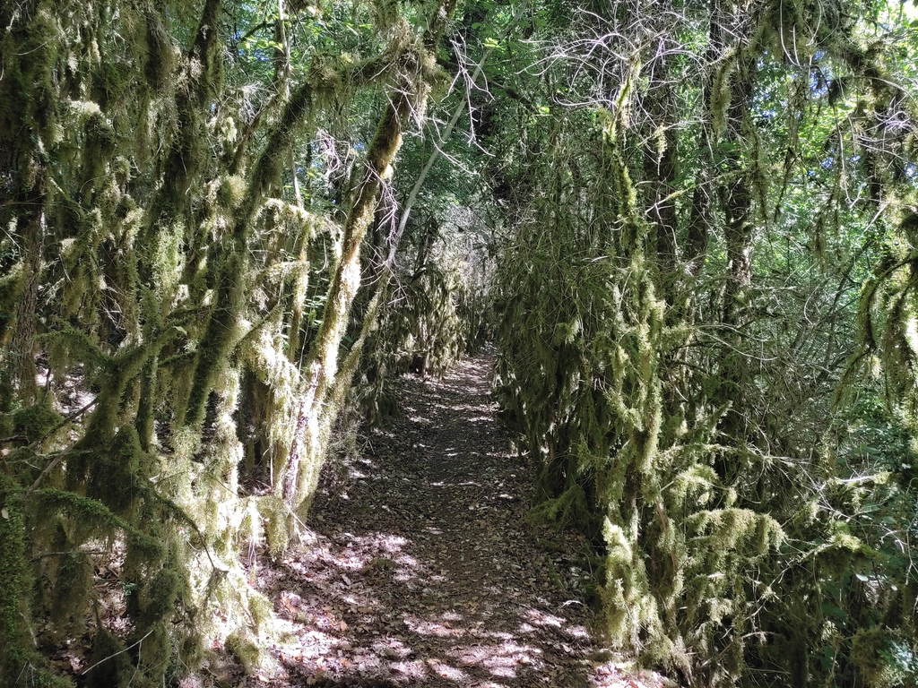 La randonnée continue par une magnifique descente freins lâchés suivie par le fameux single tout en sous-bois décoré par une mince chevelure de lichens, puis une nouvelle longue côte en plein soleil. Quelques poses pour retrouver son souffle, un peu de marche à pied pour s'économiser et on repart.