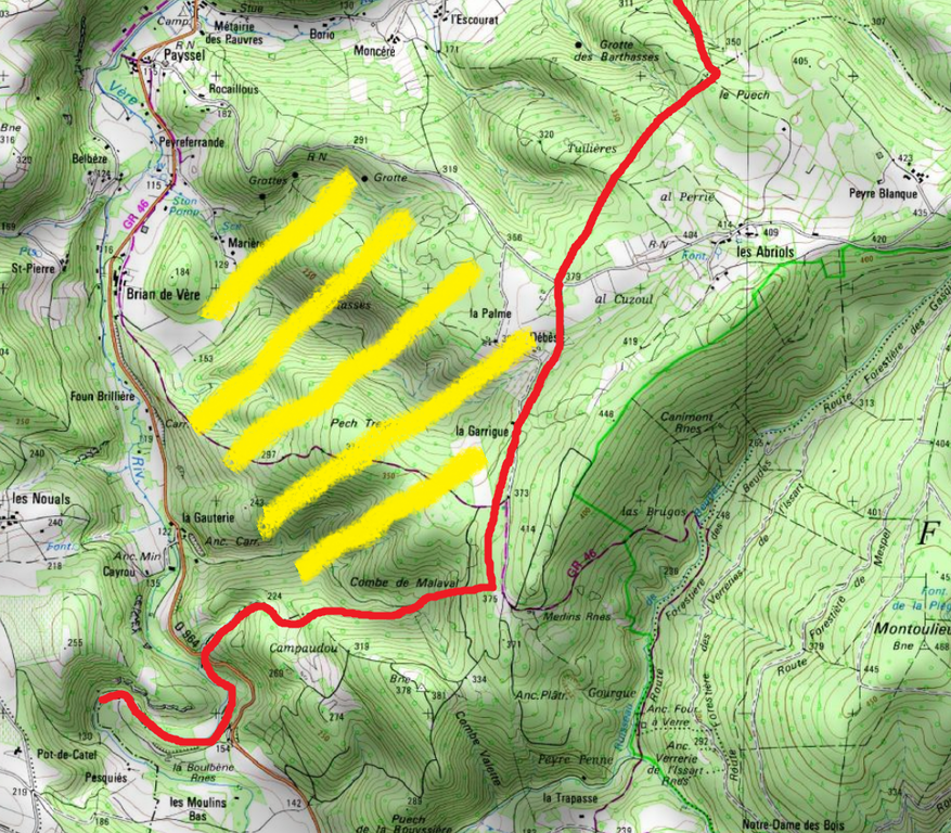 TOUTES LES TRACES OUVERTES (sauf GR et PR ) SUR DES TERRAINS PRIVES SERONT A TERME FERMÉES ET INTERDITES D’ACCÈS (secteur jaune) . De plus les Abriols étant sur la commune de Larroque (Tarn) , toutes organisations empruntant le secteur des Abriols doivent faire l’objet d’une demande d’autorisation à la mairie de Larroque .